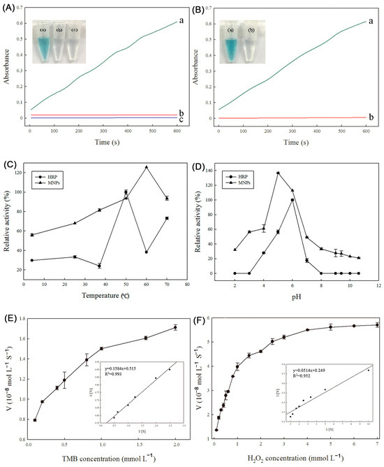 (A): The catalytic activities of MNPs in the peroxidase-like oxidation of TMB in NaAc buffer solution (pH 3.8) after 10 min (a: buffer+TMB+H2O2+Fe3(PO4)2·8H2O; b: buffer+TMB+Fe3(PO4)2·8H2O; c: buffer+H2O2+TMB). (B): The catalytic activities of MNPs and leaching solution (a: buffer+TMB+H2O2+Fe3(PO4)2·8H2O; b: buffer+TMB+H2O2+leaching solution). (C–F): Comparison of the stability of HRP and Fe3(PO4)2·8H2O ((C): temperature; (D): pH). (E,F): Steady-state kinetic assays of Fe3(PO4)2·8H2O. (E): The concentration of H2O2 was constant and the TMB concentration was varied. (F): The concentration of TMB was constant and the TMB concentration was varied. Insets are the Lineweaver–Burk plots of the double reciprocal of the Michaelis–Menten equation.