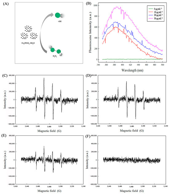 (A): Schematic diagram of Fe3(PO4)2·8H2O generating ·OH. (B): The fluorescence spectra at different concentrations of Fe3(PO4)2·8H2O. (C–F): DMPO spin-trapping ESR spectra of ·OH radicals in the H2O2-Fe3(PO4)2·8H2O reaction system at different concentrations of Fe3(PO4)2·8H2O. (C): 30 µg mL−1 of Fe3(PO4)2·8H2O; (D): 20 µg mL−1 of Fe3(PO4)2·8H2O; (E): 10 µg mL−1 of Fe3(PO4)2·8H2O; (F): without Fe3(PO4)2·8H2O.