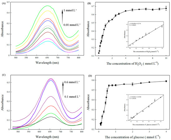 (A) The visible spectrum changes in the presence of different concentrations of H2O2. (B): The linear calibration plots for H2O2 detection. (C): The visible spectrum changes in the presence of different concentrations of glucose. (D): The linear calibration plots for glucose detection.