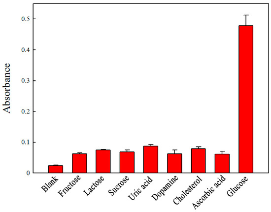 To test whether the detection of glucose is specific, control experiments were performed using fructose, lactose, sucrose, lithic acid, dopamine, cholesterol, and ascorbic acid. The selectivity of the colorimetric method is shown in Figure 7. The results showed that there was an obvious color change for the solution containing 0.5 mmol L−1 glucose. For the solutions containing 5 mmol L−1 control samples, no obvious absorption or color could be observed, which could be attributed to the high affinity of GOx for glucose. These results confirmed that the proposed assay had good selectivity toward glucose.