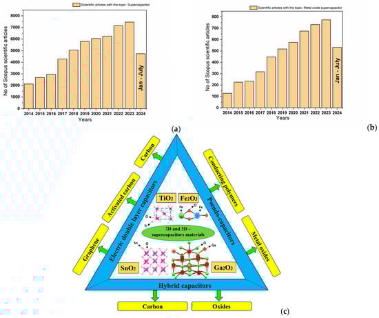 A rise in the number between 2014 and 2024 [Source Scopus date 1 August 2024] of supercapacitors publications (a) and of metal oxide supercapacitors (b); schematic diagram of the review content (c).