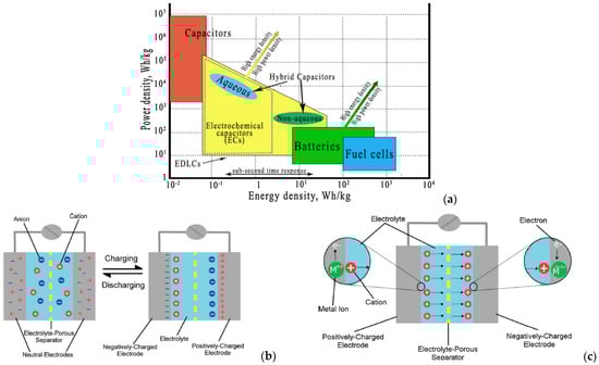 Ragone plot of performance ranges of various energy storage devices. Reproduced with permissions from ref [], copyright 2019, Elsevier (a); EDLC supercapacitor—schematic charging/discharging process (b) and Pseudocapacitor—schematic mechanism (c); Reproduced with permissions from ref [], copyright 2018, Elsevier.