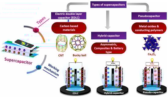 The electrochemical reaction in a normal Li-ion battery occurs differently during the charge/discharge phases; so, during the discharge phase, the battery functions as a load, and the working Li electrons move from the anode to the cathode via a separator. Also, the two conducting electrodes of conventional capacitors were separated by an insulating dielectric substance. When the voltage is delivered to the capacitor, opposite charges build up on the surface of each electrode. Figure 2a shows the Ragone plot of the performance ranges of different energy storage systems. By generating an electric field that allows the capacitors to store energy, the dielectric maintains the charge separation, as presented by the schematic in Figure 2b,c. Based on their charge storage mechanism, supercapacitors can be classified into three types: EDLCs, pseudocapacitors, and hybrid supercapacitors, as shown in Figure 3. Amongst the three types of capacitors, EDLCs are considered the most appropriate for the energy storage systems because they offer the most stable charge storage capability for long-term cycling which is the most important criterion for fabricating high performance and stable energy storage systems [].