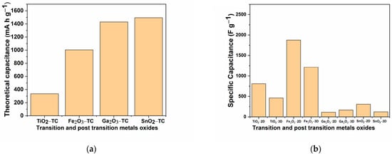 On the other hand, 3D nanostructures including 3D carbon materials, 3D vertically aligned nanomaterial (nanotube, nanowire, nanosheet), 3D porous current collector (foam and sponges’ templates), 3D foam, hydrogels, aerogels, sponge nanostructures, polyoxometalate-based 3D compounds, 3D microstructure from 3D printing process, 3D fabric-based structures, 3D porous heterostructures (oxide/carbon composite) can greatly improve the energy storage, both as 1D and 2D nanomaterials [,]. Notably, 3D nanostructures with porous and hollow designs, such as hollow metal oxides, are highly effective because they facilitate the transport of electrolyte ions, thus increasing the surface area available for redox reactions. Metal oxide materials incorporate multiple metal cations and exceed an electrochemical capacity of the pristine metal oxide because of the increased number of electroactive sites that generate an enhancement of ion transport generated by the additional metal ions. Also, the doping with metal ions shows that the introduction of multivalent and multicomponent metal oxides enhances the electrochemical performance of SCs. A theoretical specific capacitance for the selected metal oxide TiO2, Fe2O3, Ga2O3, and SnO2, and the specific capacitance for 2D and 3D structures of transition and post transition metals oxides, are graphically presented in Figure 4a,b.