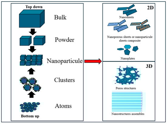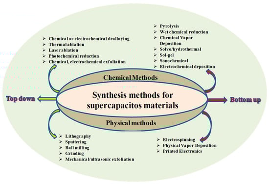 The intensive development of nanomaterials in recent periods due to intense demand has opened new perspectives in many fields such as electronics, optoelectronics, chemical catalysis, medicine, and many others. Their unique properties and enhanced characteristics generated by the small size provide a significant improvement for the future innovation of these materials. A specific area of interest over the years has been the development of nanomaterials for supercapacitors due to their high surface area and exceptional conductivity that can significantly improve their performance []. There are two main approaches in the synthesis of nanoparticles for supercapacitor applications: the top-down and the bottom-up approach []. In Figure 5, both approaches used to synthesize 2D and 3D structures for SC applications are graphically presented.