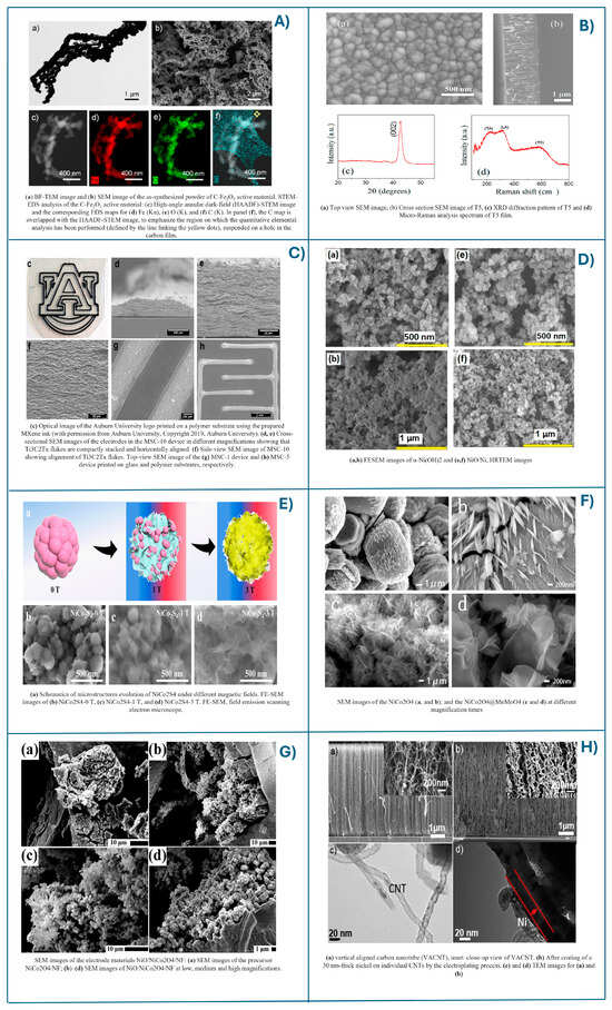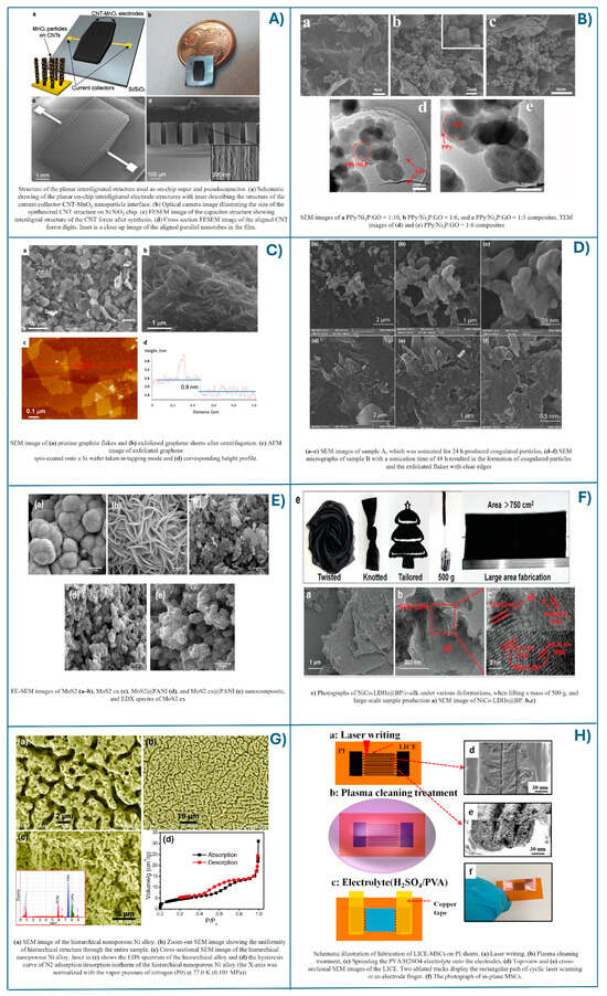 Different surface morphology and electrode fabrication for 2D and 3D supercapacitors from bottom-up approach: (A) Reprinted with permission from []. Copyright 2022, MDPI; (B) Reprinted with permission from []. Copyright 2015, Elsevier; (C) Reprinted with permission from []. Copyright 2020, American Chemical Society; (D) Reprinted with permission from []. Copyright 2022, MDPI; (E) Reprinted with permission from []. Copyright 2023, Elsevier; (F) Reprinted with permission from []. Copyright 2018, Elsevier; (G) Reprinted with permission from []. Copyright 2024, Elsevier; (H) Reprinted with permission from []. Copyright 2020, Elsevier.