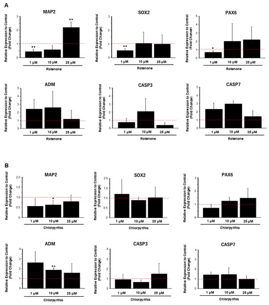 2.4. Rotenone and Chlorpyrifos Cause Neurodevelopmental Inhibition