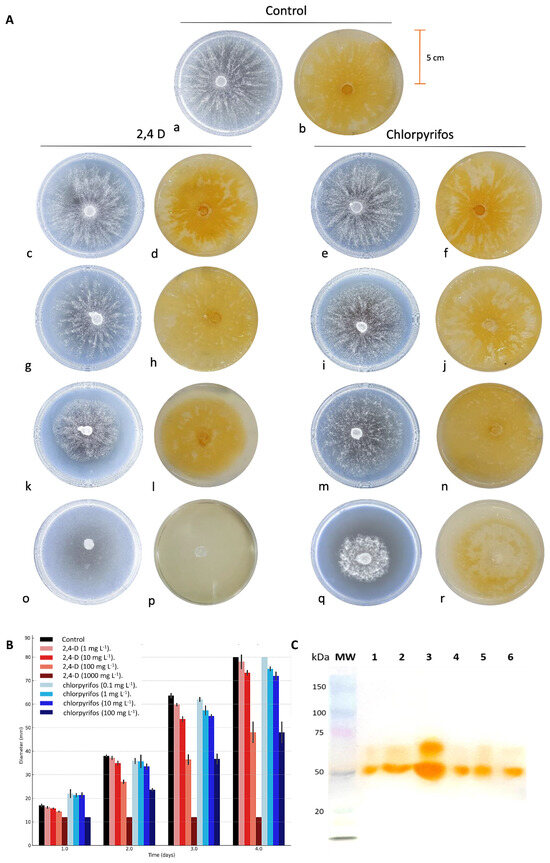 Growth pattern of P. brevispora BAFC 633 and detection of laccase activity in solid media supplemented with different concentrations of 2,4-dichlorophenoxyacetic acid (2,4-D) and chlorpyrifos (CP) (A). Macroscopic view (frontal) of mycelial appearance on solid medium containing 12.7 g L−1 malt extract and 20 g L−1 agar (MEA) (left) and laccase secretion on MEA with 2,6-dimethoxyphenol (DMP) (right), in the absence of pesticides (a,b); with 2,4-D at [1 mg L−1] (c,d), [10 mg L−1] (g,h), [100 mg L−1] (k,l), and [1000 mg L−1] (o,p); and with chlorpyrifos at [0.1 mg L−1] (e,f), [1 mg L−1] (i,j), [10 mg L−1] (m,n), and [100 mg L−1] (q,r). (B) Modeling fungal growth of P. brevispora BAFC 633 in solid medium. (C) Enzymatic profile obtained through SDS-PAGE and incubated with DMP for P. brevispora BAFC 633. (1) 2,4-D [1 mg L−1]. (2) 2,4-D [100 mg L−1]. (3) P. brevispora BAFC 633 without pesticides. (4) CP [100 mg L−1]. (5) CP [1 mg L−1]. (6) CP [0.1 mg L−1]. (MW): molecular weight.