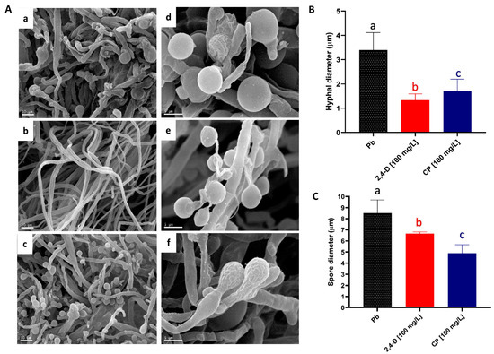 Ultrastructural analysis of P. brevispora BAFC 633 in the presence of pesticides. (A) Scanning electron micrographs of P. brevispora BAFC 633 grown on MEA medium: (a) hyphae in control conditions without pesticides, (b) hyphae in the presence of 2,4-dichlorophenoxyacetic acid (2,4-D) [1000 mg L−1], (c) hyphae in the presence of chlorpyrifos (CP) [10 mg L−1]; (d) basidiospores in control conditions without pesticides, (e) basidiospores in the presence of 2,4-D [1000 mg L−1], and (f) basidiospores in the presence of chlorpyrifos [10 mg L−1]. (B) Comparison of mean diameters of hyphae and spores (C) of P. brevispora BAFC 633 with 12 days of incubation in medium with 2,4-D, CP, and their control (without pesticides). Mean diameters with different letters indicate a significant difference (p < 0.05). For each image obtained via SEM, 50 measurements were taken using the ImageJ 1.46r (National Institutes of Health (NIH) Bethesdam MD, EE.UU) program, and statistical analysis was performed with Statgraphics Centurion XVI.I (Statgraphics Technologies, The Plains, VA, USA).