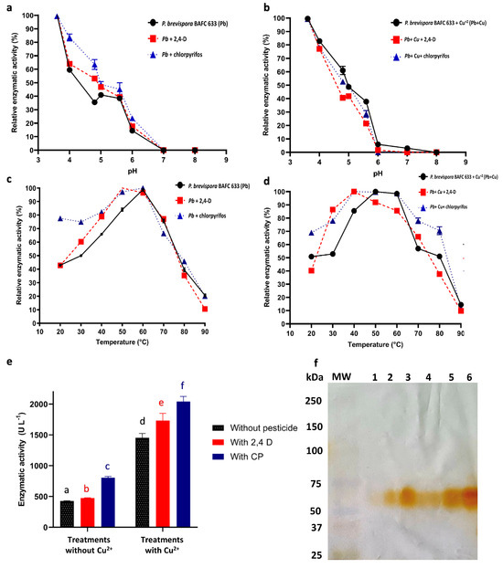 Effect of pesticides on laccase activity. (a–d) Effect of pH and temperature on laccase activity in the concentrated enzyme fraction of P. brevispora BAFC 633, after its production in the absence (left) and presence (right) of Cu2+ [1 mM] (●), and its effect in the presence of 2,4-D (■) and chlorpyrifos (CP) (▲). Data are expressed as relative enzyme activity (%), with error bars representing standard deviations of triplicate measurements. Statistical analysis (ANOVA followed by Tukey’s post hoc test) revealed no significant differences (p > 0.05) between treatments at different pH and temperature conditions. (e) Effect of pesticides on laccase activity achieved under optimal pH and temperature conditions. Data are represented as means ± standard deviations (SDs) of three replicates. Means with different letters are significantly different from each other (p < 0.05) according to a t-test. (f) Enzyme profile obtained through SDS-PAGE and incubated with DMP for the purified laccase fraction of P. brevispora BAFC 633. Lanes 1–6 represent laccase fractions from different independent inoculations.