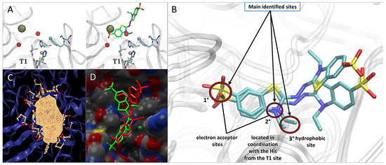 Structural analysis of the catalytic site T1 in lacI from P. brevispora BAFC 633. (A) Ideal interactions calculated at the T1 site (left). Sites aligned with the ABTS crystal of the laccase structure of the bacterium Bacillus subtilis encode PDB:3ZDW (right). The red spheres are electron acceptor sites, and the brown spheres are aromatic sites. (B) Main ligand interaction sites identified in lacI of P. brevispora BAFC 633. (C) Surface of the T1 catalytic pocket; images were obtained from DoGSiteScorer. (D) Comparison between the best poses with the co-crystallized 3ZDW structure. The ligand in the docking complex is depicted in green and 3ZDW in red. Images were obtained from Chimera 1.14.