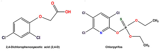 The structures of 2,4-dichlorophenoxyacetic acid (CID: 16180) and chlorpyrifos (CID: 2730) were obtained from the Pubchem database Chemical Structure Search (https://pubchem.ncbi.nlm.nih.gov/ (accessed on 12 June 2024)).