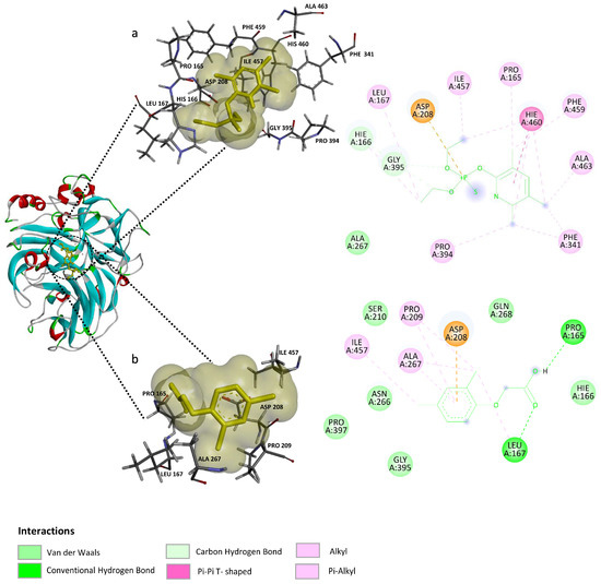 Chlorpyrifos showed the best energetic results, with a binding energy of −7.44 Kcal mol−1, in which the main contributors to the interaction were aliphatic and aromatic amino acids, notably residues His166, His460, and Phe341 (Figure 7a). In contrast, 2,4-D showed an energy of −5.06 Kcal mol−1, indicating a weaker interaction due to the lack of Pi-stacking-type interactions observed in the complex with chlorpyrifos. The compound 2,4-D bound to a site contiguous to T1, showing coordination between its carboxyl group and the Asp208 residue as the main interaction (Figure 7b). Details of the residues involved in the interactions with both pesticides are presented in Table 2.