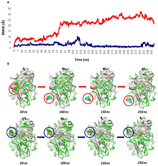 (A) Representation of the root mean square deviation (RMSD) during the DM simulation at 250 ns of lacI with 2,4-dichlorophenoxyacetic acid (2,4-D) (▬) and chlorpyrifos (CP) (▬). (B) Conformational transformation of complexes in the lacI-2,4-D system (top) and lacI-CP (bottom) during the MDS for 250 ns. The red and blue circles follow the position of each ligand on the laccase receptor during the trajectory.