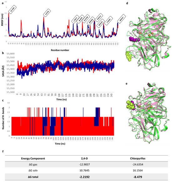 MDs simulation trajectory plots of lacI along with 2,4-dichlorophenoxyacetic acid (▬) and chlorpyrifos (▬) during 250 ns simulations. (a) The Cα root mean square fluctuation (RMSF) values of each amino acid residue for lacI in MDs simulations. (b) Solvent-accessible surface (SASA). (c) The number of hydrogen bonds formed during the protein–ligand interaction. (d,e) Structure representative of the behavior in the MDs simulation of the lacI-2,4D complex (d) and lacI–chlorpyrifos (e) at the beginning and at the end of 250 ns. The initial (pink structure) and final (green structure) conformations of the proteins are visualized, as well as the initial (purple structure) and final position (lime green structure) of the ligands. All imaging was performed in VMD. (f) Details of the results of MM/PBSA calculations on the complexes expressed in Kcal mol−1.