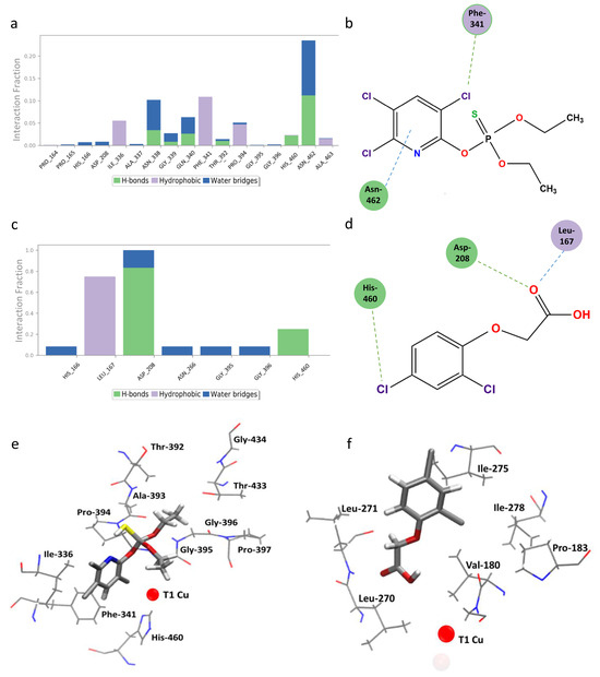 The analysis of the complexes revealed that the predominant interactions were hydrophobic, which agrees with the results of the previous coupling carried out with both ligands and the ability to stabilize the benzene ring of the compounds (Figure 10). In particular, residue His460 showed interactions for both compounds, at the beginning of the dynamics for 2,4-D and throughout the entire trajectory for chlorpyrifos. This is notable since His460 is one of the histidines that coordinate the T1 site. On the other hand, 2,4-D prioritized interaction with D228 before moving out of the binding site, indicating a polar component within a predominantly apolar site. Together, these results suggest that both compounds interacted mainly throughout the entire active site, similar to the binding of ABTS in T. versicolor laccase and the docking results with it.