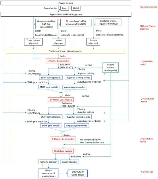 With the aim of devising a broad scheme for CRISPR/Cas9 guide design for non-model organisms, we started the process with the high-quality annotation of the reference genome. This step was necessary because the accuracy of automated ab initio gene structure prediction software is far from perfect (see, e.g., [32]). As an example organism, we used the non-model organism, M. rosenbergii, whose genome poses challenges for gene structure prediction due to its high abundance of repetitive sequences, the existence of similar but non-identical sex chromosomes, and the high level of genetic heterogeneity among individuals. Therefore, to produce high-quality gene predictions for CRISPR/Cas9 guide design, we applied a two-stage process for the annotation of the reference genome. First, we used the Maker pipeline to computationally annotate the entire genome, and then we manually improved the annotation of the selected target genes through the inspection of their predicted models along with the alignment of transcripts and proteins to the same genomic region. The entire process is depicted schematically in Figure 1.