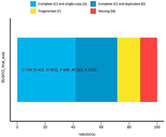 - Manni, M.; Berkeley, M.R.; Seppey, M.; Simao, F.A.; Zdobnov, E.M. BUSCO Update: Novel and Streamlined Workflows along with Broader and Deeper Phylogenetic Coverage for Scoring of Eukaryotic, Prokaryotic, and Viral Genomes. Mol. Biol. Evol. 2021, 38, 4647–4654. [Google Scholar] [CrossRef]