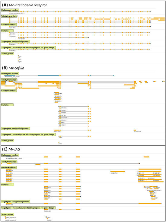 Three examples for genomic regions demonstrating various levels of agreement between the evidence alignments and the final gene model. JBrowse view of the genomic region surrounding the (A) Mr-vitellogenin receptor (GenBank GU454802.1); (B) Mr-cofilin (GenBank OL743530.1); and the (C) Mr-IAG (GenBank FJ409645.1) genes. The following tracks are displayed on the Jbrowse genome browser from top to bottom: Maker gene models—final gene predictions made by the Maker; Trinity transcripts—genome alignment of Trinity-assembled transcriptome; GenBank mRNAs—genome alignment of M. rosenbergii mRNA sequences from NCBI; proteins—genome alignment of the crustacean proteins from NCBI; target gene original alignment—genome alignment of the mRNA of interest; target gene manually curated coding regions for guide design—coding exon locations for guide design, based on the manual inspection of the above tracks. Tested guides represented in the bottom track. The genomic sequence of the region shown in panel (B), as well as the sequences and positions of the features in this region, are available in Files S1–S6.