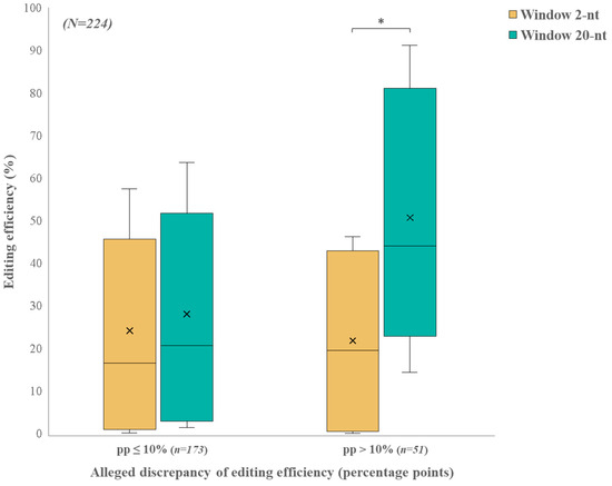 Comparison of AEE between the 2-nt and 20-nt windows for different sgRNAs. AEE distribution for 224 target sites in M. rosenbergii primary cell culture grouped by window size around the CRISPR/Cas9 cut-site and conditioned by their AEE difference. This comparison illustrates the distribution of the AEEs for windows 2 and 20 for two conditions: sgRNAs with ≤10 percentage points in the AEE and sgRNAs with >10 percentage points. The horizontal line within each box represents the median. The tops and bottoms of each box correspond to the 5th and 95th percentiles. The whiskers above and below each box denote the minimum and maximum values. The mean is denoted by “×”. Asterisk represents a significant difference between the distribution of the AEEs for windows 2 and 20 (Repeated measures ANOVA, p < 0.001).