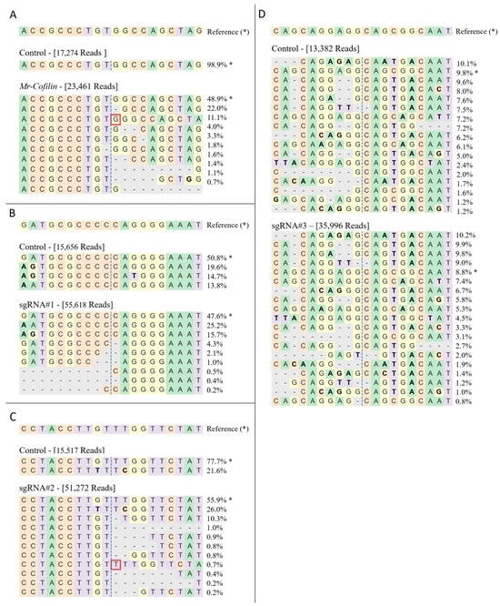 The NGS results for the positive control sgRNA Mr-cofilin showed, as expected, real CRISPR/Cas9 editing (Figure 5A and Table S2). For the sgRNA-free sample, there were only 0.18% and 1.15% of the modified reads in windows 2 and 20, respectively. In the sgRNA-treated sample, windows 2 and 20 showed that 40.97% and 51.09%, respectively, of the total reads were modified sequences.