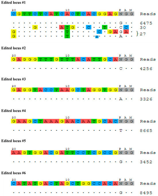 Off-target assessment is of both basic and applied importance in model and non-model organisms. The GUIDE-seq (genome-wide unbiased identification of DSBs evaluated by sequencing) method was thus implemented for off-target identification via the insertion of double-stranded oligodeoxynucleotides (dsODN). For all the six edited loci that were examined, the donor dsODN was successfully integrated into on-target sites. For most of the targeted loci, no off-target sites were identified. The only off-target events that were discerned were those in edited locus #1, but even in this case, the number of reads for these off-target events was much lower than the number of reads for the on-target incorporations: there were 6475 reads for the on-target sequence and 57 off-target incorporations, which represented 0.0087% of the total reads (Figure 6).