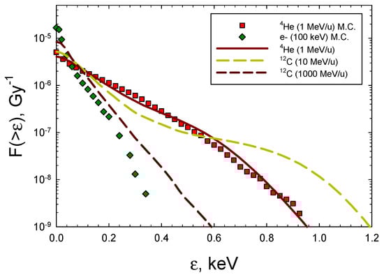- Cucinotta, F.A.; Nikjoo, H.; Goodhead, D.T. Model of the radial distribution of energy imparted in nanometer volumes from HZE particles. Radiat. Res. 2000, 153, 459–468. [Google Scholar] [CrossRef]