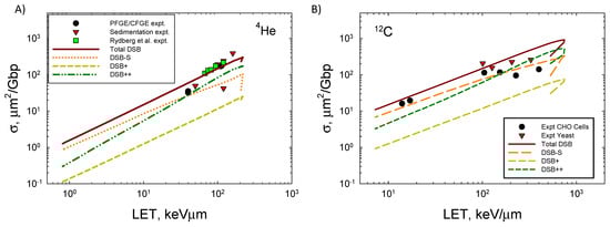- Frankenberg, D.; Brede, H.J.; Schrewe, U.J.; Steinmetz, C.; Frankenberg-Schwager, M.; Kasten, G.; Pralle, E. Induction of DNA double-strand breaks by 1H and 4He ions in primary human skin fibroblasts in the LET range of 8 to 124 keV/μm. Radiat. Res. 1999, 151, 540–549. [Google Scholar] [CrossRef]