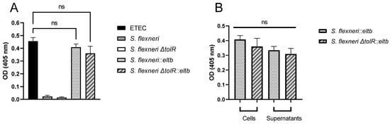 LTB detection in ETEC and different parental or transgenic Shigella flexneri strains using a GM1 capture-ELISA. (A) The presence of LTB was confirmed on ETEC and S. flexneri::eltb and ΔtolR::eltb strains. (B) In LTB-positive samples, no significant differences were observed between cell-associated and bacterial culture supernatant fractions. [ns, not significant (p ≥ 0.05)].