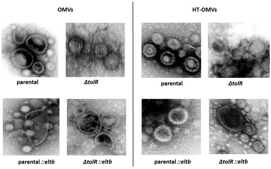 Representative transmission electron microscopy (TEM) images of OMVs and HT-OMVs isolated from parental Shigella flexneri, S. flexneri ΔtolR mutant, and their respective recombinant containing eltb (scale bar = 200 nm).