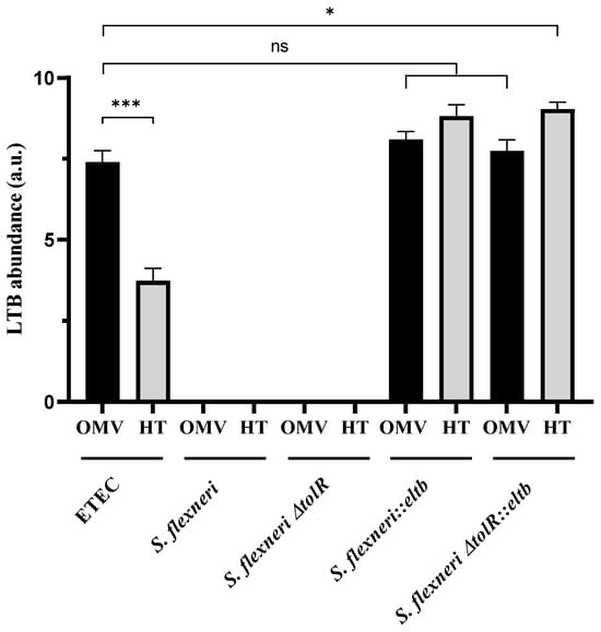 Proteomic analysis identified LTB abundance in the different OMV and HT products from ETEC and Shigella flexneri or mutant (ΔtolR), with and without the eltb insertion. Samples were analyzed in triplicates and the protein abundance was normalized to the total protein (*, p < 0.05; ***, p < 0.001; ns, non-significant; a.u.: arbitrary units).