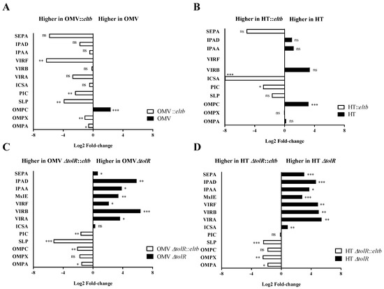 Differential expression of the main outer membrane proteins and virulence factors included in OMV and HT products from Shigella flexneri wild-type (A,B) or mutant ΔtolR (C,D) before (black) and after eltb mutation (white). Proteins were clustered in two groups based on their expression profile. Samples were analyzed in triplicates and the Log2 of the fold change is represented (*, p < 0.05, **, p < 0.01, ***, p < 0.001; ns, non-significant).