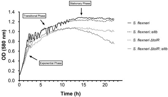 Bacterial growth curves of Shigella flexneri wt, S. flexneri::eltb, S. flexneri ΔtolR, and S. flexneri ΔtolR::eltb. Bacterial suspensions were inoculated on Bioscreen C multi-well plates and incubated with continuous shaking at 37 °C. Absorbance values (O.D.580 nm) were automatically read at regular intervals of 10 min for 22 h. An arbitrary position of the stationary phase is indicated according to the growth curve kinetics.