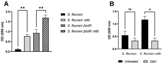 Biofilm formation assay results. (A) Comparison of biofilm formation among recombinant and parental Shigella flexneri strains, showing significant increases in biofilm production for the S. flexneri::eltb and S. flexneri ΔtolR::eltb strains (**, p < 0.01) compared to the parental strains. (B) Evaluation of LTB involvement in biofilm formation, showing a significant decrease in biofilm formation capacity after the addition of GM1, the natural receptor of LTB (*, p < 0.05), with no significant differences observed in the parental strain (ns).