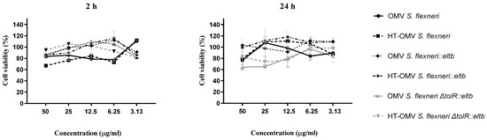 In order to evaluate the cytotoxicity of the vesicles, HeLa cells were treated with different concentrations (ranging from 3 to 50 μg/mL) of OMV or HT-OMV products derived from the different Shigella strains. Results showed no significant differences between samples at 2 or 24 h of incubation. The cell viability was above 60% even at the highest concentrations, increasing up to 90–100% as concentrations decreased (Figure 7).