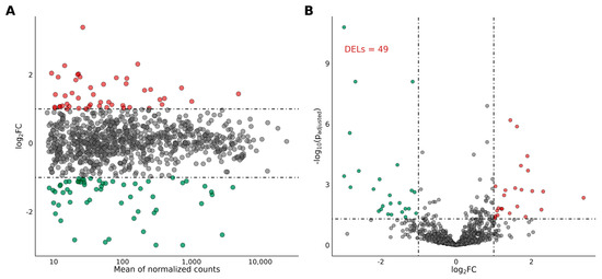 MA (A) and Volcano (B) plot presenting differentially expressed genes (DEGs; P-adjusted < 0.05 and log2FC ≥ |1.0|) and lncRNAs (DELs; P-adjusted < 0.05 and log2FC ≥ |1.0|) identified in the ovaries of tumor-bearing rats on the basis of the expression comparison performed between the CPA + TAM group and the CPA group. Red circles depict upregulated DEGs/DELs and green circles represent downregulated DEGs/DELs. Gray circles represent DEGs or DELs with no significant changes in expression.