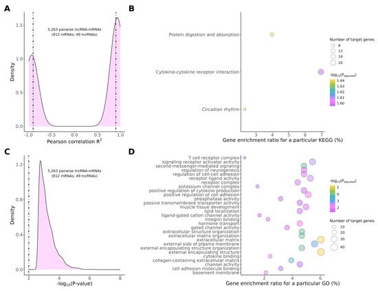 To explore the regulatory mechanisms of trans-acting lncRNAs and their target mRNAs, co-expression analysis was performed based on DEGs and DELs using previously described methodology [32,33]. After filtration based on the p-value (p < 0.01) and Pearson’s correlation coefficient (|R2-value| > 0.9), 5263 pairwise lncRNA–mRNAs were identified (Figure 3A). These uniquely co-expressed transcript pairs included 812 DEGs and 49 DELs and the statistical significance of the correlation between co-expressed mRNA–lncRNA pairs was high (Figure 3A,C). To investigate the potential functional role of lncRNA, KEGG and GO enrichment analysis was applied using the co-expressed DEGs and DELs. The co-expressed DEGs were enriched in three main KEGG pathways—protein digestion and absorption, cytokine–cytokine receptor interactions, and circadian rhythm (Figure 3B; Table S5). Several significant GO terms were connected with extracellular matrix organization and remodeling, second-messenger-mediated signaling, signaling receptor activity, regulation of cell adhesion, and transmembrane activity (Figure 3D, Table S6).