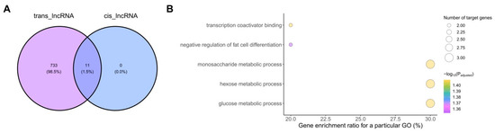 Moreover, twenty-three cis-type correlations were identified, including five negative correlations and 18 positive correlations (Table S9). Of these, eleven DELs appeared to differently cis-regulate eleven DEGs (Table S10). The cis-regulated target DEGs were enriched (p < 0.05) in GO terms related to metabolic processes (GO:0019318, GO:0006006, GO:0005996), negative regulation of fat cell differentiation (GO:0045599), and transcription co-activator binding (GO:0001223; Figure 4B, Table S11). Additional analyses revealed that all eleven cis-regulating DELs were also interacting with distant transcripts in a trans-regulating manner (Figure 4A).