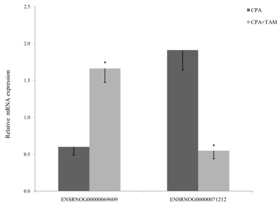 Real-time PCR was used to validate the results of RNA-Seq by measuring the expression of two selected DELs identified in the ovaries of tumor-bearing rats treated with CPA + TAM vs.rats treated with CPA alone (ENSRNOG00000069609 and ENSRNOG00000071212). The validation was performed on the RNA samples used for RNA-Seq (n = 4 rats/group). Complementary DNA was reverse-transcribed from 1 µg of total RNA isolated from biological replicates using the Omniscript RT Kit (Qiagen, Hilden, Germany) with 0.5 μM oligo(dT)15 primer (Roche, Basel, Switzerland), 1 μM hexanucleotide primers, and 10 U RNase Out (SigmaAldrich, St. Louis, MO, USA) in a Veriti Thermal Cycler (Thermofisher Scientific, Waltham, MA, USA) at 37 °C for 1 h. Glyceraldehyde 3-phosphate dehydrogenase (GAPDH) and β-actin were used as reference genes. qRT-PCR was performed using the TaqMan Universal PCR Master Mix and TaqMan Gene Expression Assay (Thermofisher Scientific) in an Applied Biosystems7500 Fast Real-Time PCR System (Thermofisher Scientific). The amplification cycle was as follows: initial denaturation at 95 °C for 10 min, 40 cycles of denaturation at 95 °C for 15 s, and primer annealing at 60 °C for 1 min. qRT-PCR for each of four biological replicates was carried out in duplicate and a non-template control was included in each run. The gene expression level was normalized to GAPDH and β-actin to attain the relative expression using the comparative cycle threshold (CT) method and the quantity-based active schematic estimating (Q-BASE) model, and it was expressed as arbitrary units (mean ± SEM). The differences in lncRNA expression level between samples were evaluated using a Student’s t-test (Statistica Software Inc., Tulsa, OK, USA). Differences with a probability of p-value <0.05 were considered significant.