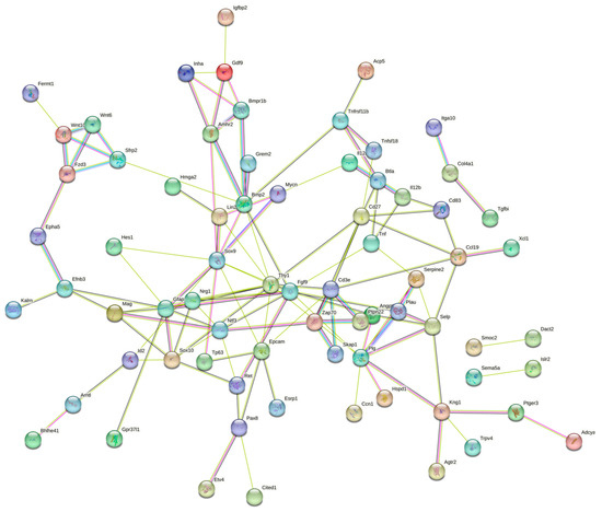 Interaction network of target DEGs potentially regulated by lncRNAs (DELs) identified in the ovaries of rats treated with cyclophosphamide (CPA) plus tamoxifen vs. rats treated with CPA alone. The network was generated by STRING (confidence score: 0.4) using DEGs (P-adjusted < 0.05 and log2 fold change ≥ 1.0) related to apoptosis and cell adhesion. Enrichment p-value: 1.0 × 10−16.