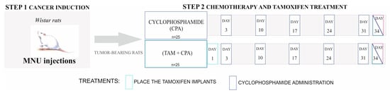 All procedures involving rats were approved by the Animal Ethics Committee of the University of Warmia and Mazury in Olsztyn, Poland (No. 78/2017/WNP). Female Wistar rats (6 weeks old, n = 125) were housed in a controlled environment (22 °C; 60% humidity; 12L:12D) in the Center of Experimental Medicine (Bialystok, Poland), with ad libitum access to food and water. To induce mammary gland tumors, N-methyl-N-nitrosourea (MNU; Toronto Research Chemicals, Canada; 50 mg/kg b.w.) was administered (ip) twice to 100 rats, at 7 and 19 weeks of age [11]. The remaining 25 rats, which constituted a non-tumor control group (CNT), received the vehicle (0.9% NaCl, 0.05% acetic acid) at these times. The presence of tumors or neoplastic lesions in rats was confirmed by a certified pathologist. A detailed description, as well as the weight of animals and tumor sizes, was reported in our previous paper [23]. At 31 weeks of age, the MNU-treated rats (n = 100), hereafter called tumor-bearing rats, were randomly assigned to the following groups (n = 25/group): 1/cyclophosphamide (CPA)-treated group and 2/(CPA + TAM)-treated group (Figure 7).