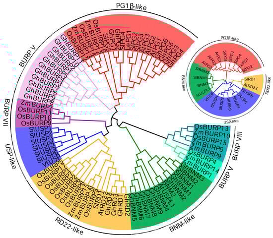 To date, the BURP gene family has been studied in numerous plants, including alfalfa (Medicago truncatula) [], jujube (Ziziphus jujuba) [], cotton (Gossypium hirsutum) [], common bean (Phaseolus vulgaris) [] and rose (Rosa chinensis) []. The BNM2-like, USP-like, RD22-like and PG1β-like subfamilies were four classic subfamilies of BURP family []. In addition, from further studies, other subfamilies were identified in the BURP family []. Studies on the functions of some BURP genes showed diverse roles during different processes of plant growth. For example, BNM2 (a BURP protein of Brassica napus), VfUSP (a BURP protein of Vicia faba) and ASG1 (a BURP protein of Panicum maximum) all might regulate spore formation during embryonic development [,,]. OsRAFTIN1 and RA8 (two BURP proteins of rice) were involved in another development [,]. AtUSPL1, a member of the RD22-like subfamily, was involved in seed development []. Additionally, SCB1 (a BURP gene of soybean) was expressed specifically in the seed coat and might have an important role in the cell differentiation of the seed coat []. GhRD1, a BURP gene in cotton, activated by GhHOX3 and GhHD1, promoted cotton fiber elongation []. PG1β, a BURP protein in tomato, was involved in fruit maturation, as it affects pectin solubilization and degradation [,].