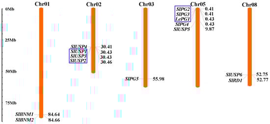 The distribution of SlBURPs on tomato chromosomes showed that these genes were unevenly located on five chromosomes (Figure 2). Among them, chromosome 05 contained the most SlBURPs (5), followed by chromosome 02 (4). Chromosomes 01 and 08 contained two SlBURPs, while chromosome 03 only contained one SlBURP (SlPG5). The analysis of duplication events in the SlBURP family showed two tandem duplication clusters, containing three (SlUSP1 to SlUSP3, and LePG1 to SlPG3) SlBURPs, respectively. The results indicated that the expansion of USP-like and PG1β-like subfamilies in tomato may derive from tandem duplication events.
