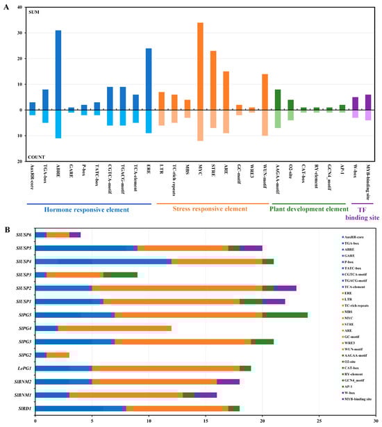 Analysis of cis-acting elements in SlBURP promoters. (A) The statistics of different cis-acting elements in the promoters of SlBURP family genes. (B) The distribution of different cis-acting elements in SlBURP promoters. SUM: the total number of cis-acting elements in SlBURP promoters; COUNT: the number of SlBURPs whose promoter contains the respective elements; different colors represent different element types.