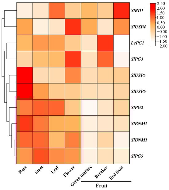 To explore the potential functions of SlBURPs during tomato growth, qRT-PCR was used to analyze the expression of 10 SlBURPs (excluding SlUSP1-SlUSP3 for high sequence similarity and SlPG4 for almost no expression in different tissues) in various tomato tissues, including roots, stems, leaves, flowers and fruits at different stages (Figure 5). The expressions of SlBURPs showed spatio-temporal specificity. SlPG2, SlBNM1, SlBNM2 and SlPG5 were highly expressed in different tissues, except fruits, at different stages. Notably, LePG1 and SlRD1 showed generally high expression in different tissues, especially in breaker stage or red fruit. Additionally, SlUSP5 and SlUSP6 exhibited root specific expressions, and SlUSP4 and SlPG3 were highly expressed in flowers. The results indicate that SlBURPs may perform various functions in plant development.