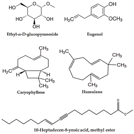 The results obtained from the current study show that, as demonstrated in Table 1, the flower buds of S. aromaticum yielded an adequate amount of extract and contained promising phytochemical constituents, including phenols, flavonoids, saponins, and anthocyanins, and have high percentages of DPPH scavenging activity [,,,]. Furthermore, GC-MS analysis of SAE revealed the presence of pharmacologically important phytochemical compounds, including ethyl-α-D-glucopyranoside, eugenol, caryophyllene, and humulene (see Table 2 and Figure 1). Consistently with our investigation, previous reports demonstrated that SAE contains bioactive compounds and that eugenol was the richest compound found when different extraction methods were used [,].