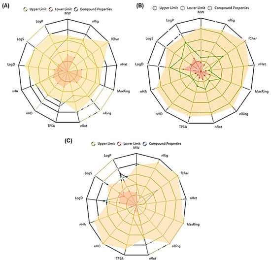 Radar chart for ADMET screening showing the upper, lower, and predicted values of various physicochemical and molecular properties of DOX (A), eugenol (B), and 10-Heptadecen-8-ynoic acid, methyl ester (C). MW, molecular weight; nRig, number of rigid bonds; fChar, formal charge; nHet, number of heteroatoms; MaxRing, number of atoms in the biggest ring; nRing, number of rings; nRot, number of rotatable bonds; TPSA, topological polar surface area; nHD, number of hydrogen bond donors; nHA, number of hydrogen bond acceptors; LogP, Log of the octanol–water partition coefficient; LogS, Log of the aqueous solubility; LogD, Log at physiological pH (7.4).