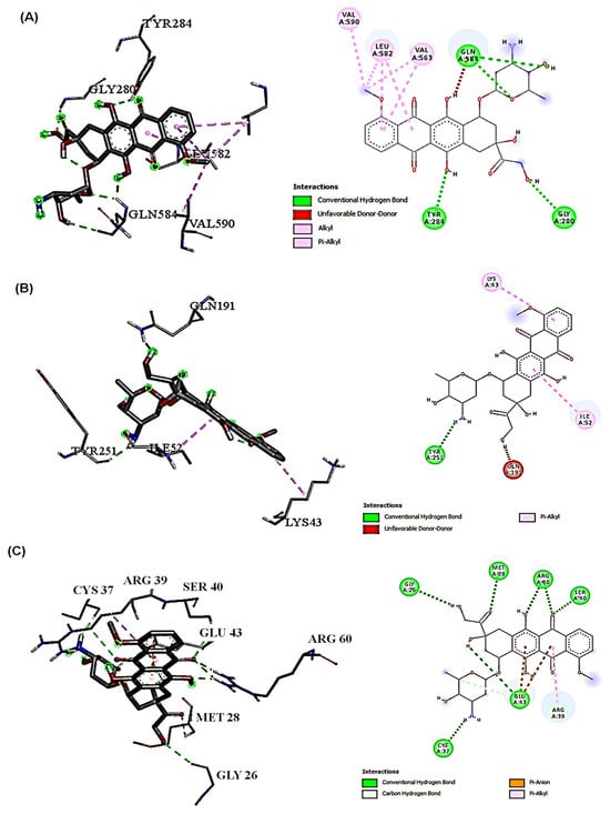 DOX interactions with three target proteins (NRF-2, SLC7A-11, and GPX-4) (2D and 3D). (A) DOX interaction with NRF-2, the conventional H-bond (GLY280, TYR284, GLN584, and GLN584), and the hydrophobic interactions (VAL563, LEU582, and VAL590); (B) DOX interaction with SLC7A-11, the conventional H-bond (TYR251), and the hydrophobic interactions (ILE52 and LYS43); (C) DOX interaction with GPX-4, the conventional H-bond (MET28, SER40, ARG60, GLU43, GLY26, CYS37, and LYS595), the carbon H-bond (ARG39 and GLU43), the Pi–Anion interaction (GLU43), and the Pi–Alkyl interaction (ARG39).