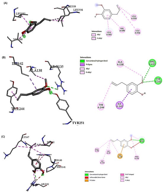 Eugenol interactions with three target proteins (NRF-2, SLC7A-11, and GPX-4) (2D and 3D). (A) Eugenol interaction with NRF-2 and the hydrophobic interactions (LEU556, LEU559, LEU582, and VAL590); (B) Eugenol interaction with SLC7A-11, the conventional H-bond (ARG135 and TYR251), and the hydrophobic interactions (ILE142, ALA138, and TYR244); (C) Eugenol interaction with GPX-4, the conventional H-bond (ARG32), and the hydrophobic interactions (HIS140, ALA46, ARG32, PRO141, LYS47, ILE132, and HIS140).