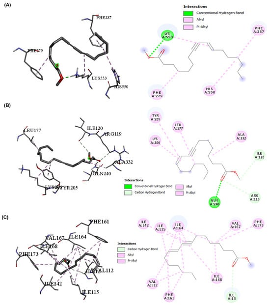 10-Heptadecen-8-ynoic acid, methyl ester interactions with three target proteins (NRF-2, SLC7A-11, and GPX-4) (2D and 3D). (A) The interaction with NRF-2, the conventional H-bond (LYS553), and the hydrophobic interactions (PHE279, PHE287, and HIS550); (B) The interaction with SLC7A-11, the conventional H-bond (GLN240), the carbon H-bond (ARG119 and ILE120), and the hydrophobic interactions (LYS206, ALA332, LEU177, and TYR205); (C) The interaction with GPX-4, the carbon H-bond (ILE13), and the hydrophobic interactions (VAL112, ILE115, ILE142, ILE164, VAL167, ILE168, PHE161, and PHE173).
